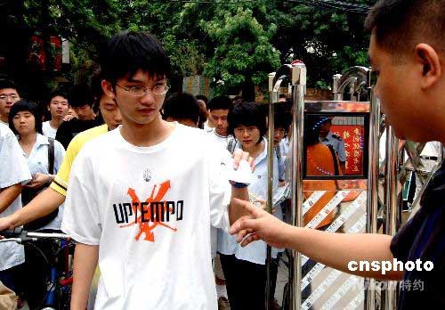 參加首日高考的福州考生步入福州銅盤中學(xué)考點(diǎn)時,主動出示準(zhǔn)考證和身份證。中新社發(fā) 劉可耕 攝