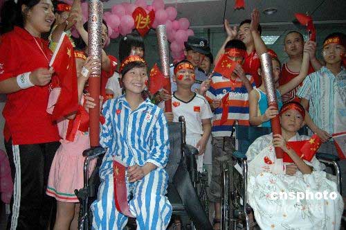 傳遞結(jié)束后,五名火炬手趕到廣西醫(yī)科大學(xué)附屬醫(yī)院,看望在這里治療的四川地震災(zāi)區(qū)傷員,并讓他們與“祥云”親密接觸,了卻看奧運(yùn)圣火傳遞的心愿。中新社發(fā) 蔣雪林 攝