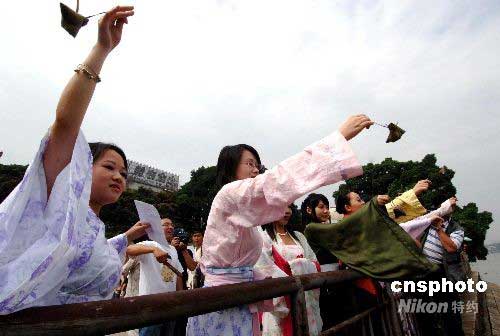 眾多身著傳統(tǒng)漢服的福建青年女子紛紛向閩江投粽子,端午時節(jié)祭悼屈原。中新社發(fā) 劉可耕 攝