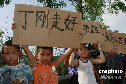 6月9日下午,四川省遂寧市數(shù)千群眾自發(fā)來到烈士陵園公墓,送別遂寧市優(yōu)秀的抗震救災英雄丁剛。今年40歲的丁剛,是遂寧市船山區(qū)一名普通居民,6月3日參加遂寧市應急民兵營一連突擊隊,赴災區(qū)抗震救災。5日18時30分許在映秀鎮(zhèn)搜尋失事直升飛機時,遇山體滑坡,為救戰(zhàn)友,被飛石擊中頭部,不幸犧牲。6月9日下午3點30分,遂寧市政府、遂寧軍分區(qū)為丁剛同志舉行遺體告別儀式,以告慰英靈。中新社發(fā) 鐘 敏 攝