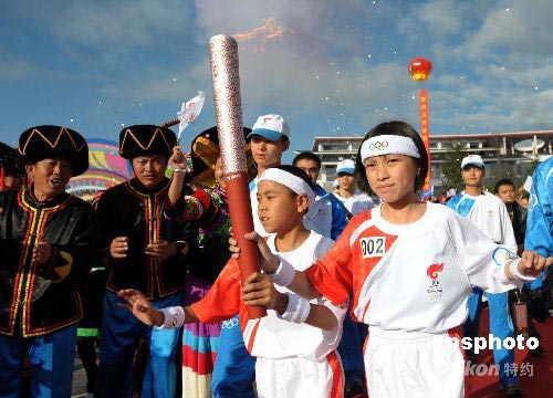 6月10日,奧運(yùn)圣火在云南麗江開始傳遞,四川汶川地震孤兒張紫蘭(右)與云南麗江地震孤兒和震生共同傳遞首棒火炬。1996年,云南麗江曾發(fā)生7級(jí)地震。中新社發(fā) 廖攀 攝