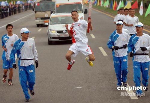 6月10日,奧運(yùn)圣火在云南麗江傳遞,53號火炬手馬亮武傳遞火炬時騰空歡愉。中新社發(fā) 廖攀 攝