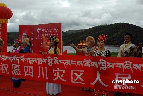 奧運圣火在云南香格里拉傳遞,在結(jié)束儀式現(xiàn)場,全場共同高歌《一個媽媽的女兒》,為四川災(zāi)區(qū)人民祝福。 中新社發(fā) 石雨 攝