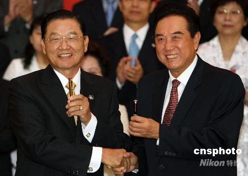 峽兩岸關系協(xié)會會長陳云林(右)與臺灣海峽交流基金會董事長江丙坤在簽署“兩岸周末包機”和“大陸居民赴臺旅游”協(xié)議后,交換簽字筆。中新社發(fā) 任晨鳴 攝