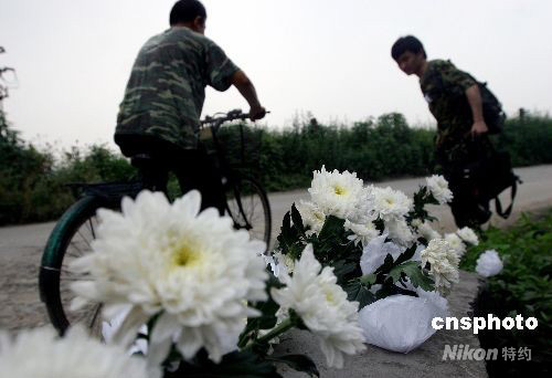 6月13日,在進(jìn)入成都鳳凰山機(jī)場(chǎng)的道路上,附近民眾自發(fā)在路邊擺設(shè)白花,悼念失事直升機(jī)遇難機(jī)組人員。中新社發(fā) 劉新 攝