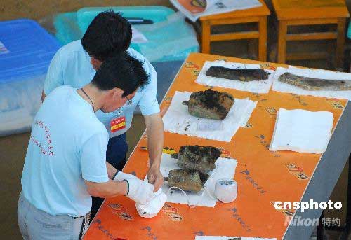 考古人員在對(duì)提取上來(lái)的青銅器進(jìn)行簡(jiǎn)單處理。中新社發(fā) 從啟 攝
