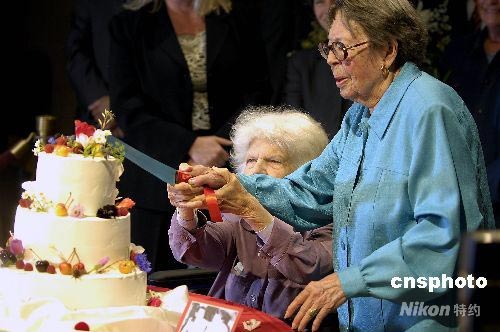 女同性戀者八十七歲的德?tīng)枴ゑR。ㄗ螅┖桶耸臍q的菲莉斯·里昂(右),在相愛(ài)五十五年后,終于領(lǐng)取了結(jié)婚證書(shū)。中新社發(fā) 陳鋼 攝