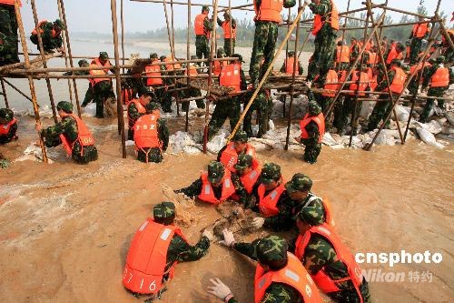 6月18日,山東省軍區(qū)和濟南警備區(qū)在濟南西郊玉清湖附近黃河大堤舉行大型防汛搶險演練。來自濟南市的10支民兵預備役部隊、黃河專業(yè)搶險隊等共1300余名隊員演練了水情偵察、封堵決口、爆破分洪、管涌搶護、堤壩搶護、緊急營救、搶筑子堤等七項防汛搶險科目。中新社發(fā) 周青先 攝