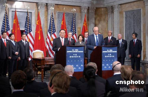 當(dāng)?shù)貢r間6月18日下午,剛剛結(jié)束中美第四次戰(zhàn)略經(jīng)濟(jì)對話的中國副總理王岐山和美國財政部長保爾森,在華盛頓共同會見記者。隨后雙方簽署《中美能源環(huán)境十年合作框架》文件。中新社發(fā) 管黎明 攝