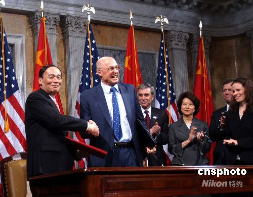 當(dāng)?shù)貢r間6月18日,中美在華盛頓簽署《中美能源環(huán)境十年合作框架》文件。圖為中國副總理王岐山和美國財政部長保爾森在簽字儀式上。中新社發(fā) 管黎明 攝