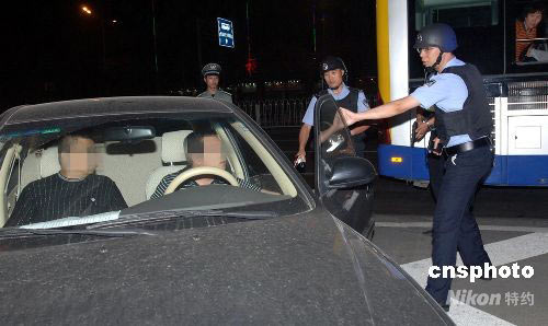 六月十九日夜,北京豐臺(tái)警方舉行奧運(yùn)安保演練,進(jìn)行設(shè)卡攔截演習(xí)。五十余輛警車迅速到達(dá)進(jìn)出北京方向和相關(guān)環(huán)線的各個(gè)路口執(zhí)行攔截任務(wù),并成功將“犯罪嫌疑人”截獲。中新社發(fā) 楊陽 攝