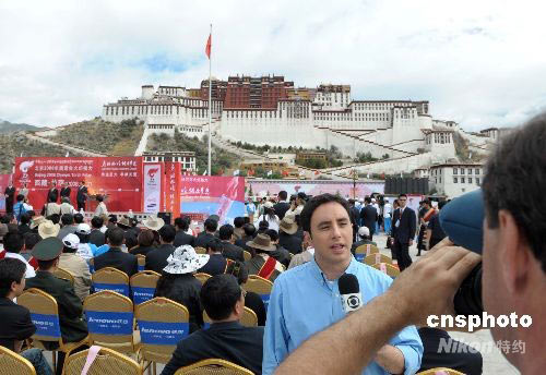 圖:境外記者現(xiàn)場報道奧運火炬?zhèn)鬟f