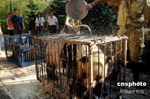 圖為福州大熊貓世界員工為4只來福州的臥龍大熊貓進(jìn)行入舍前消毒洗塵。中新社發(fā) 鄭祚聲 攝