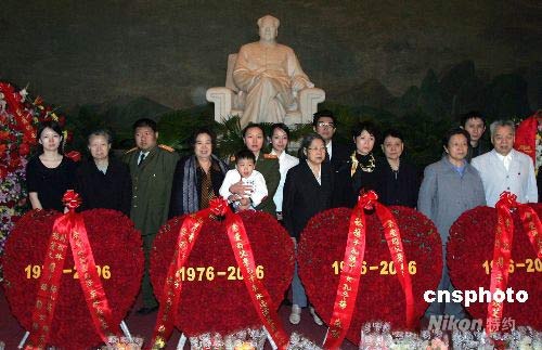 資料圖為2006年9月9日毛澤東逝世三十周年紀(jì)念日,毛澤東的親屬匯聚位于北京天安門(mén)廣場(chǎng)的“毛主席紀(jì)念堂”敬獻(xiàn)鮮花。劉思齊(左二,毛澤東長(zhǎng)子毛岸英之妻)、毛新宇(左三,毛澤東之孫)、邵華(左四,毛澤東之子毛岸青妻子)、毛東東(左五,毛澤東重孫)、劉濱(左六,毛澤東孫媳婦)、李敏(左八,毛澤東女兒)、孔繼寧(左九,毛澤東外孫)、孔東梅(左十,毛澤東外孫女)、李訥(右三,毛澤東女兒)、王孝芝(右二,毛澤東外孫)、王景清(右一,毛澤東女婿)等獻(xiàn)花后,在毛澤東塑像前合影。中新社發(fā) 任晨鳴 攝