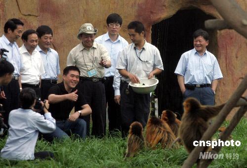 6月25日上午,臺北市長郝龍斌一行到上海野生動物園,看望大熊貓和金絲猴。郝龍斌希望上海的大熊貓和金絲猴能落戶臺北,此外臺北的紅毛猩猩、白毛長臂猿能來到上海。并題詞:關(guān)心生態(tài)愛護(hù)野生動物是進(jìn)步城市的重要指標(biāo)。中新社發(fā) 潘索菲 攝