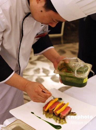 6月25日晚,由國家體育總局訓練局、中國烹飪協(xié)會西餐專業(yè)委員會和亨氏公司聯(lián)合主辦的“亨氏冠軍西餐,引領健康美味”主題活動發(fā)布會暨體育概念創(chuàng)意菜肴征集活動頒獎典禮在北京舉行。此次活動歷時近兩個月,吸引了近百家京城優(yōu)秀的西餐廳和潮流餐廳踴躍參與,近百道創(chuàng)意紛呈的體育概念菜肴亮相。左岸春天、漢萊國際美食百匯、梧桐、北京亞太花園酒店、西堤牛排、挪威北極菜、金融街洲際酒店季候風、香格里拉飯店藍韻、希爾頓元素閣和希爾頓三煌苑等十家餐廳所創(chuàng)作的菜品憑借出色的菜肴創(chuàng)意和體育概念闡述,榮獲了本次活動的最高榮譽“特金獎”。作為本次活動的成果展示和廚藝交流,獲獎餐廳的大廚們現(xiàn)場制作和展示了集健康、美味于一體的體育概念菜品。圖為廚師們現(xiàn)場制作獨特創(chuàng)意的體育菜肴。 中新社發(fā) 錢興強 攝