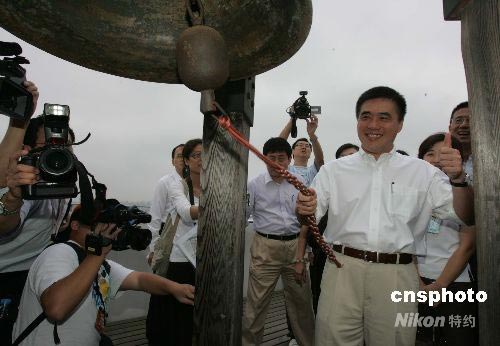 6月26日,臺北市市長郝龍斌在滬考察正在建造中的上海世博會參展場址、了解世博會籌備情形,并撞鐘祝福上海世博會成功。中新社發(fā) 潘索菲 攝
