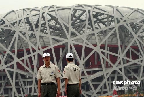 6月28日,兩位安保人員在北京奧運會主體育場——國家體育場(“鳥巢”)外巡視。當日,“鳥巢”正式落成。中新社發(fā) 盛佳鵬 攝