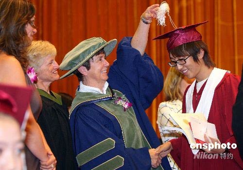 六月二十八日,北京中加學(xué)校2008年高中及IHM專業(yè)學(xué)生畢業(yè)典禮在北京人民大會堂舉行,321名學(xué)生經(jīng)過在該校三年的學(xué)習(xí),獲得中國和加拿大兩國高中畢業(yè)證書,其中有314名學(xué)生申請了加拿大的大學(xué),并被加拿大及歐美、澳大利亞共68所大學(xué)錄取,錄取率為100%。圖為加拿大教育官員為畢業(yè)學(xué)生撥帽繩。中新社發(fā) 毛建軍 攝