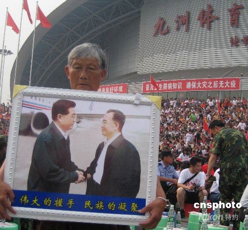 綿陽一受災老嫗手捧胡溫合影觀看慰問演出