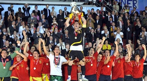 北京時(shí)間6月30號(hào)凌晨,2008歐洲杯決賽在奧地利維也納的恩斯特-哈佩爾球場(chǎng)打響。西班牙隊(duì)1比0力克德國(guó)隊(duì)奪得冠軍,斗牛士軍團(tuán)44年后再次登上歐洲之巔。“金童”托雷斯打入全場(chǎng)唯一進(jìn)球。由于德國(guó)隊(duì)的波多爾斯基沒(méi)能取得進(jìn)球,本場(chǎng)因傷休戰(zhàn)的西班牙射手比利亞以4個(gè)進(jìn)球當(dāng)選最佳射手。