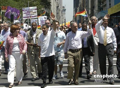 6月29日,紐約市市長彭博(右二)走在同性戀大游行隊(duì)伍的最前面。這場世界上最大的“同志”游行每年六月的最后一個(gè)周末在曼哈頓繁華的第五大道上舉行,游行隊(duì)伍從52街一直走到格林威治村的石墻旅館,以紀(jì)念1969年發(fā)生在這里的同性戀者為爭取權(quán)益與警方發(fā)生的沖突。中新社發(fā) 魏晞 攝
