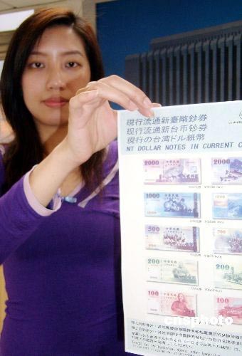 為迎接即將到來的大陸觀光團,臺灣“中央銀行”以簡體字、日文及英文等文字,印制相關(guān)宣導(dǎo)資料,張貼于金融機構(gòu)、外幣收兌處,宣導(dǎo)新版新臺幣的樣式。中新社發(fā) CNA 攝