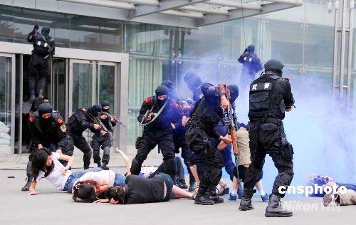 6月30日,山東省反恐怖工作協(xié)調(diào)小組在濟南成功舉行了“泰山2008”反恐演習(xí)!疤┥2008”反恐演習(xí)以北京奧運會期間可能發(fā)生的恐怖襲擊事件為背景,以有效防范和正確處置為課題,主要目的是檢驗和提升山東省城市防范處置恐怖襲擊事件的應(yīng)急反應(yīng)能力、組織指揮能力和綜合保障能力。這次演習(xí)是山東省第一次公安各警種與武警、衛(wèi)生、市政等反恐應(yīng)急力量協(xié)同作戰(zhàn)的合成演習(xí),是第一次以導(dǎo)調(diào)推演方式進行的檢驗性演習(xí),也是第一次通過全省公安視音頻系統(tǒng)同步傳輸?shù)姆纯盅萘?xí)。中新社發(fā) 陳 進 攝