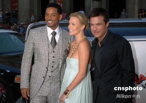 當(dāng)?shù)貢r(shí)間六月三十日晚,索尼電影公司出品的喜劇動作片《全民超人》(Hancock)在好萊塢中國劇場舉行盛大首映式,明星紅地毯走秀規(guī)?氨葕W斯卡頒獎禮。圖為影片男主角扮演者威爾·史密斯(左)、女主角扮演者查理茲·塞隆和男二號扮演者杰森·貝特曼共同出席首映式。中新社發(fā) 張煒 攝