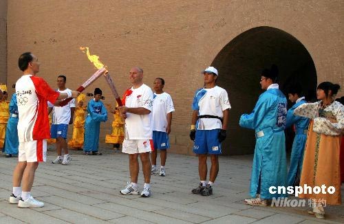 韓國籍火炬手李賢求(左一)和德國籍火炬手羅曼在嘉峪關關城內(nèi)交接火炬。 中新社發(fā) 周兆軍 攝