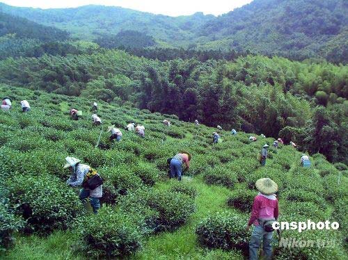 七月間正值臺(tái)灣阿里山地區(qū)采茶季節(jié),大清早開始工作的茶農(nóng)在茶園采茶。中新社發(fā) 徐長(zhǎng)安 攝