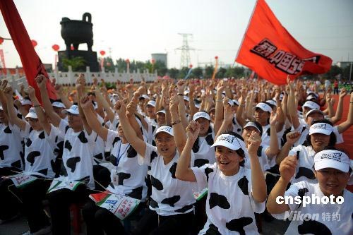 圖:內(nèi)蒙民眾身著奶牛服裝迎接奧運火炬