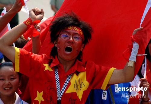 7月8日,奧運(yùn)火炬在內(nèi)蒙古呼和浩特傳遞,一名青年裝束紅火為奧運(yùn)助威加油。 中新社發(fā) 廖攀 攝