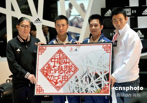 七月八日,香港體育協(xié)會(huì)暨奧委會(huì)會(huì)長(zhǎng)霍震霆、香港“乒乓孖寶”李靜、高禮澤及劉德華在香港時(shí)代廣場(chǎng)出席adidas“專為北京打造”奧運(yùn)產(chǎn)品展覽開幕儀式,歌影紅星劉德華致送一幅寫上“中國(guó)、香港隊(duì)加油”的剪紙予李靜、高禮澤,以展示港人對(duì)中國(guó)及香港奧運(yùn)代表隊(duì)的支持。中新社發(fā) 鄧慶樂 攝