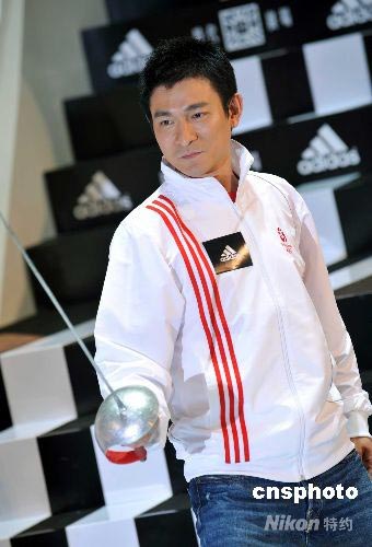 七月八日,北京奧運(yùn)會(huì)合作伙伴adidas在香港舉行“專為北京打造”奧運(yùn)產(chǎn)品展覽開幕儀式,歌影紅星劉德華出席為活動(dòng)宣傳造勢,并于活動(dòng)上模仿?lián)魟?dòng)作。 中新社發(fā) 鄧慶樂 攝