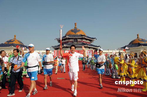 7月9日上午8時(shí)30分左右,隨著首棒火炬手、內(nèi)蒙古獲得殘奧會(huì)金牌第一人哈斯勞高擎“祥云”火炬在成吉思汗陵前跑出第一棒,北京奧運(yùn)火炬在鄂爾多斯的傳遞拉開了帷幕。 中新社發(fā) 廖攀 攝