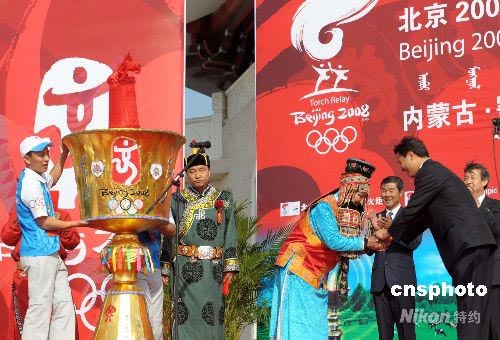 在成吉思汗陵舉行的起跑儀式上,鄂爾多斯蒙古族民眾向北京奧組委贈送自己手工縫制的奧運圣燈。中新社發(fā) 廖攀 攝