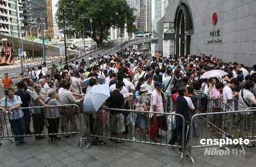 七月十五日,數(shù)千香港市民在中銀香港總部外等待領(lǐng)取奧運(yùn)紀(jì)念鈔票購物憑證。三百七十六萬張港幣奧運(yùn)紀(jì)念鈔票十六日才發(fā)售,但在開售前的五十小時(shí),已有數(shù)以千計(jì)的市民前往中銀相關(guān)分行外排隊(duì)等候。中新社發(fā) 武仲林 攝