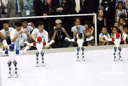 7月16日,2008機(jī)器人世界杯賽在蘇州國際博覽中心舉行,約有來自30個(gè)國家的300多支隊(duì)伍的1400多名參賽者及學(xué)者參加此次比賽和學(xué)術(shù)研討會。據(jù)悉,本屆機(jī)器人世界杯賽是首次在中國舉辦,同時(shí)也開創(chuàng)了在發(fā)展中國家舉辦機(jī)器人世界杯賽的先河。中新社發(fā) 徐志強(qiáng) 攝