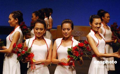 北京奧運(yùn)會頒獎儀式志愿者雙胞胎姐妹李曉曄、李子曄在北京展示奧運(yùn)頒獎鮮花。中新社發(fā) 王東明 攝