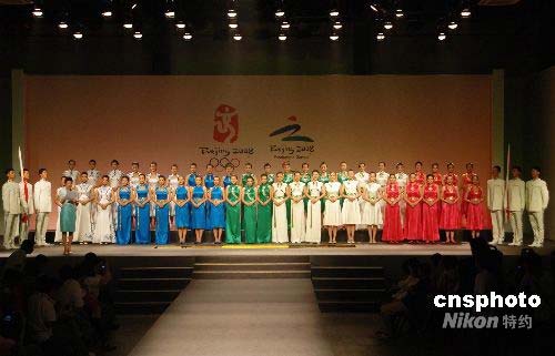 北京奧運(yùn)會(huì)頒獎(jiǎng)禮儀服裝在北京正式發(fā)布。中新社發(fā) 王東明 攝