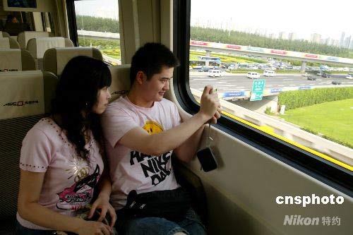 圖為一對(duì)情侶在機(jī)場(chǎng)專線上用相機(jī)拍攝沿途美景。