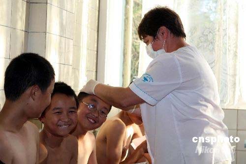 7月19日,184名來自中國(guó)四川地震災(zāi)區(qū)兒童抵達(dá)黑海岸邊的全俄“雛鷹”兒童中心,進(jìn)行三周康復(fù)療養(yǎng)。圖為兒童中心的醫(yī)生為這些初到的中國(guó)小客人檢查身體。中新社發(fā) 田冰 攝