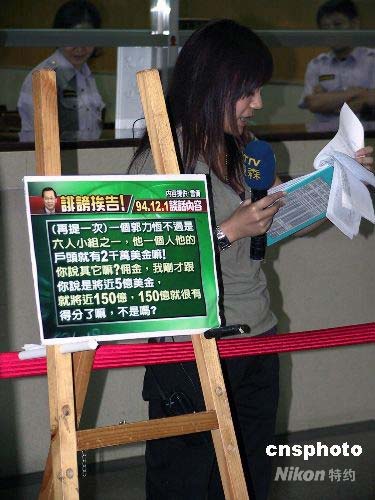 7月21日上午,臺(tái)北地方法院開(kāi)庭審理臺(tái)灣前海軍軍官雷學(xué)明控告臺(tái)灣地區(qū)前領(lǐng)導(dǎo)人陳水扁等人誹謗案。這是陳水扁卸任后首度至法院出庭,臺(tái)灣媒體對(duì)此高度關(guān)注。圖為在臺(tái)北地院內(nèi),媒體制作看板,女記者在現(xiàn)場(chǎng)報(bào)道案情審理進(jìn)展。中新社發(fā) 徐長(zhǎng)安 攝