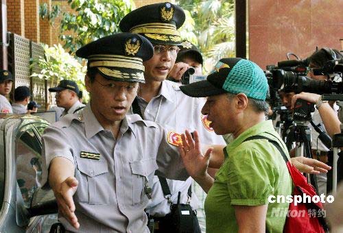 7月21日,臺灣前海軍中將雷學明等控告陳水扁等人誹謗案在臺北地方法院開庭。這是是陳水扁卸任臺灣領導人后首度至法院出庭,創(chuàng)下卸任領導人以被告出庭的首例。為此,大批警方出動維持秩序,不過仍發(fā)生陳水扁上午在步入法院時遭一民眾踹一腳的意外。圖為警方在法院門口勸離一民眾。中新社發(fā) 黃少華 攝