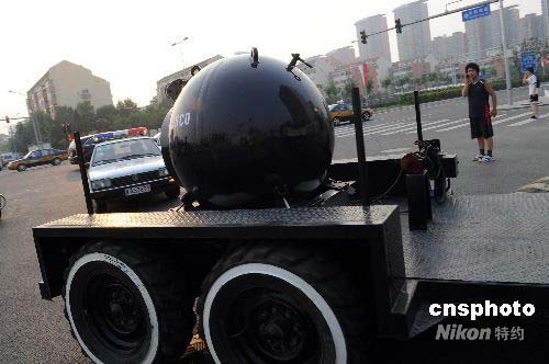 7月23日傍晚,北京警方將一批安保防恐設備運抵奧運會主場館區(qū)域。中新社發(fā) 陳文 攝