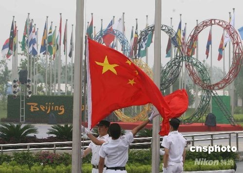 7月27日,北京奧運會的運動員之家——奧運村正式開村,來自205個國家和地區(qū)的16000名運動員和隨隊官員將逐步入住。圖為中國代表團升旗儀式。中新社發(fā) 武仲林 攝