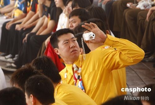 7月27日,北京奧運村正式開村,中國籃球隊隊員王治郅隨身攜帶了一部照相機,在開村儀式上四處捕捉有趣的畫面留念。中新社發(fā) 杜洋 攝