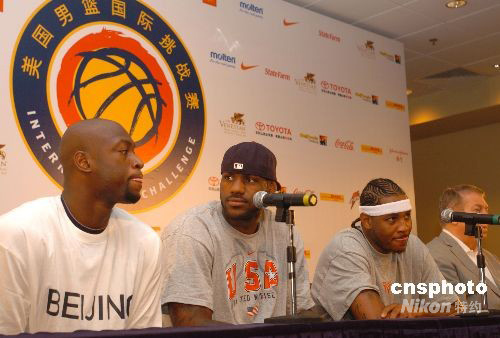 圖為七月二十八日抵達(dá)澳門的美國球員德懷恩·韋德(左一)、勒布朗·詹姆斯(左二)及卡梅隆·安東尼出席記者會。美國國家男籃隊將于七月三十一日及八月一日在澳門與土耳其及立陶宛隊進(jìn)行兩場奧運熱身賽。中新社發(fā) 畢永光 攝