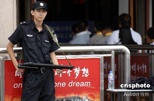 7月29日,北京火車站乘客入口處,警員持槍警戒。北京奧運臨近,警方加強安保,以力!捌桨矈W運”。 中新社發(fā) 王東明 攝